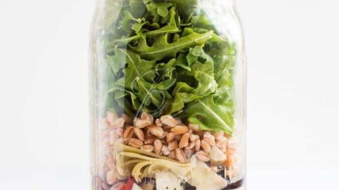 "This Mediterranean farro salad can be meal prepped two ways: in a mason jar or a meal prep container. It’s the perfect vegetarian meal prep salad recipe with a mix of chickpeas, farro, artichoke hearts, mozzarella and sun-dried tomatoes."