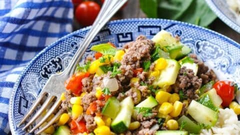 "Loaded with fresh seasonal produce, this easy Ground Beef Dinner with Summer Vegetables is a simple and healthy dish that the whole family will love. Serve the meat and veggies with rice, pasta, or your favorite bread for a one-pot 30-minute meal!"