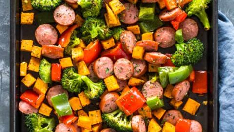 "Sausage, sweet potato, broccoli, and bell peppers seasoned with olive oil, garlic, Italian seasoning and roasted to perfection. This quick 20-minute meal is a low-carb, healthy and packed full of flavor dinner option that is also great for meal-prep too!"