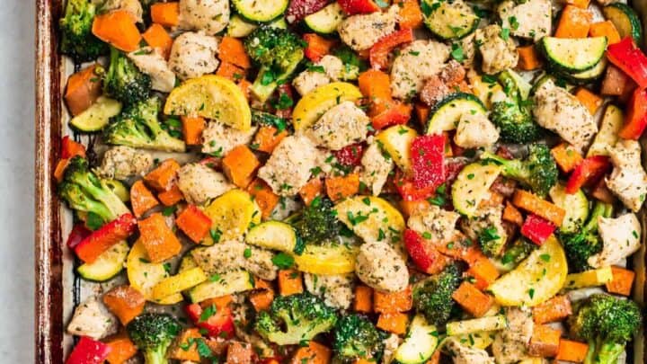 "Sheet Pan Chicken and Rainbow Veggies. Healthy one-pan meal with broccoli, sweet potatoes and zucchini, baked with lemon and Parmesan. Quick and delicious!" Serve over rice, quinoa, pasta, or a salad to round out the meal.