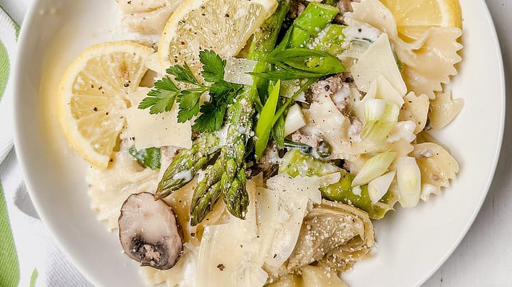 A simple, delicious 30-minute spring pasta dish with artichokes, asparagus, and ground turkey in creamy lemon sauce. It's an easy dish you'll love all season!