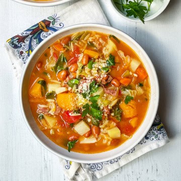 Minestrone Soup with Orzo and Kale is a hearty, healthy, and delicious Tuscan Bean Soup recipe often served during the cooler months in Tuscany.