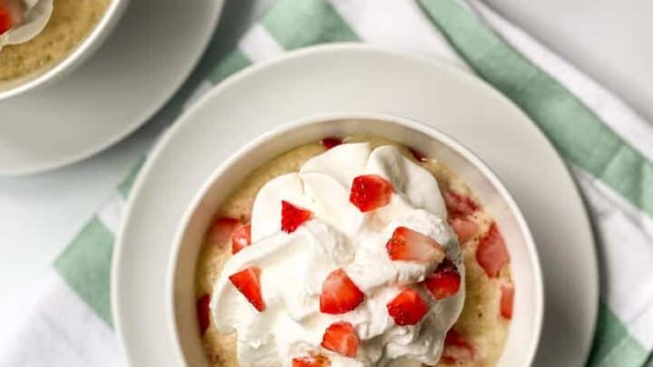 This 2 Minute Strawberry Mug Cake is a sweet microwave treat that brings to mind, Strawberries and Cream. And the reminder that the strawberry season isn't too far off.