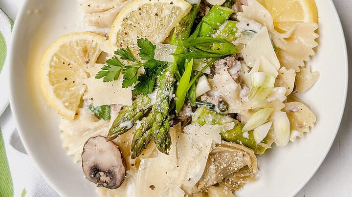This One-Pot Asparagus Pasta is a simple, delicious 30-minute spring pasta dish with artichokes, asparagus, and ground turkey in creamy lemon sauce. It’s an easy dish you’ll love all season!
