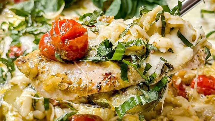 One Pan Caprese Pesto Chicken Orzo