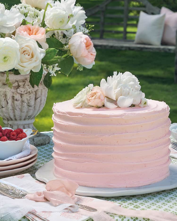 "To create a pièce de résistance worthy of the guest of honor, use a large fluted decorating trip to transform a frosted cake into a blushing bouquet. Pipe a series of equally proportioned rosettes around the base, and continue adding rows, overlapping each one slightly, until the sides and top are completely covered in petal-soft whorls of buttercream."