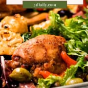 This muffaletta chicken recipe is an easy sheet pan dinner made with chicken thighs, cauliflower, olive salad, salami, roasted red peppers, and fresh greens. It has all the bold flavors of a muffaletta sandwich in a lighter, weeknight-friendly meal that comes together mostly in one pan.