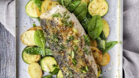 This easy recipe for Sheet Pan Baked Fish with Vegetables is a perfect quick and healthy dinner served with snow peas, potatoes & zucchini.