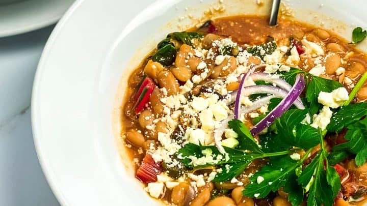 This White Bean Stew with Kale is a spicy and hearty bowl of healthy, creamy comfort food, ready in about 20 minutes. With a vibrant blend of herbs and spices, much like Harissa, often found in Tunisian cuisine.