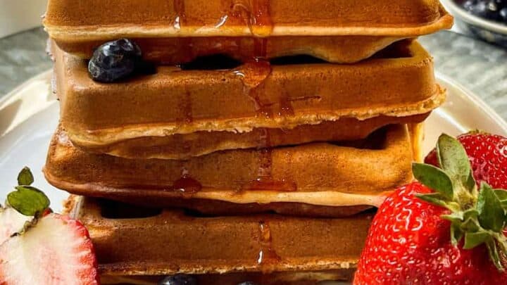 This Whole Wheat Waffles recipe is a delicious and healthy whole-grain waffle that's crisp, light, and utterly delicious. Made with 100% whole wheat flour, it has no refined sugar and freezes beautifully.