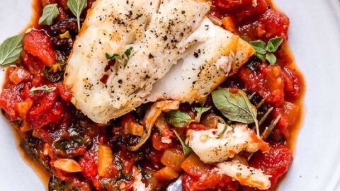 "This healthy Mediterranean Sea Bass is smothered in a piquant, healthy, Mediterranean-inspired sauce made from tomatoes, white wine, fennel and olives."