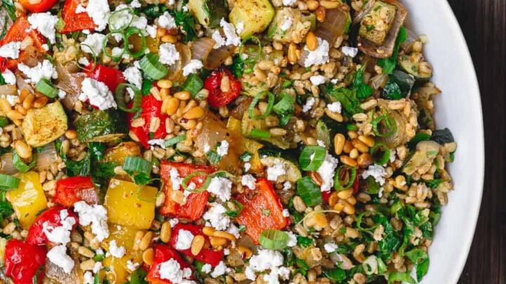 "This roasted vegetable barley recipe is prepared Mediterranean-style...chockful of flavor, texture and goodness. Bonus, you can make this ahead as part of your meal-prep! Omit the feta for a vegan option."