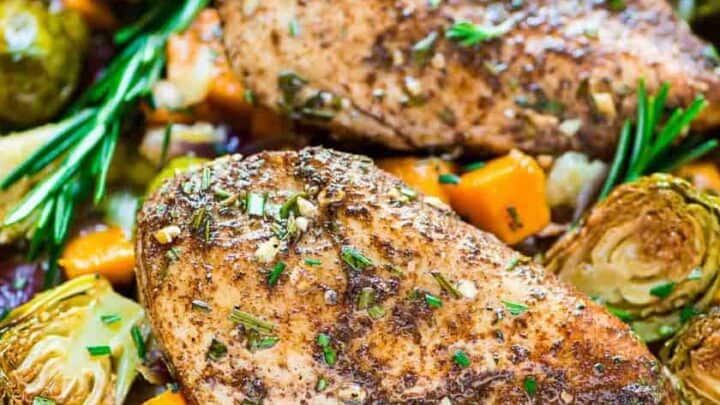 Tuesday's dinner is a scrumptious chicken sheet pan dinner filled with autumn flavors and vegetables like sweet potatoes and Brussel sprouts. Ready in about 30 minutes!