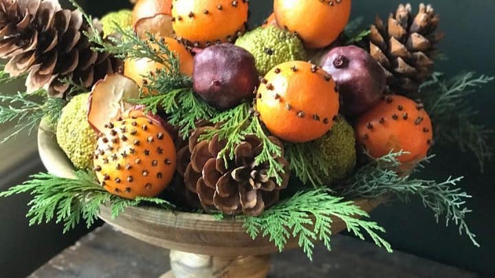 "Filling the house with fragrance and tradition. Love my orange and clove pomanders mixed with osage oranges (hedge apples) pine cones and evergreen."