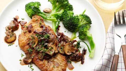"Smothered in low-calorie sauteed mushrooms and sun-dried tomatoes, this dish is both healthy and satisfying. A little bit of butter goes a long way in the sauce-just a touch adds creamy richness."