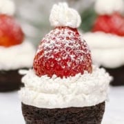 Welcome the Christmas season with a fun, festive, and incredibly easy holiday dessert. These Santa Hat Brownie Bites are made with mini brownies, fresh strawberries, and a snowy dollop of whipped cream and come together in minutes!