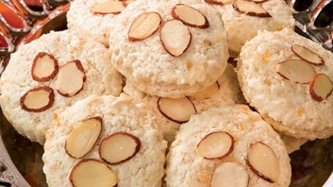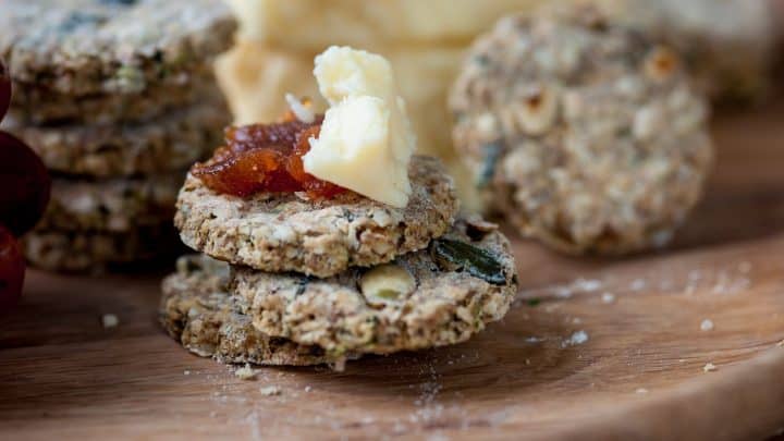 "Dundee Biscuits, also known as Scottish oat cakes, dress up nicely when garnished with almonds."
