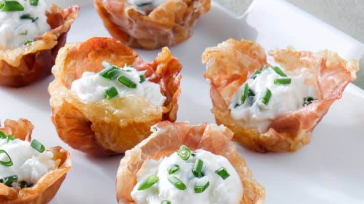 A simple, beautiful and delicious bite-size cup formed from Prosciutto and topped with a dollop of goat's cheese and minced chives.