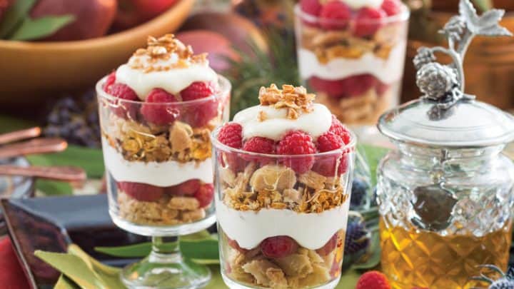 "Concluding the gathering on a sweetly refreshing note, delectable Cranachan Trifle showcases crumbles of fresh-baked shortbread, ruby-hued ribbons of plump raspberries, clouds of decadent whisky cream, sprinklings of crunchy homemade granola, and a garnish of honey."