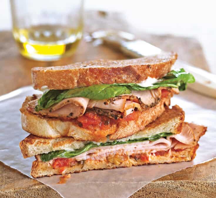 A delicious sandwich that features spinach, turkey, and walnut on delicious bruschetta and is toasted to perfection. Add a bowl of soup for an easy September weeknight dinner.