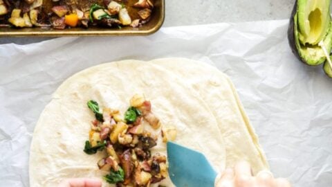 Sheet pan veggies and bacon, eggs, cilantro, avocado, and salsa come together in these loaded breakfast-style burritos.