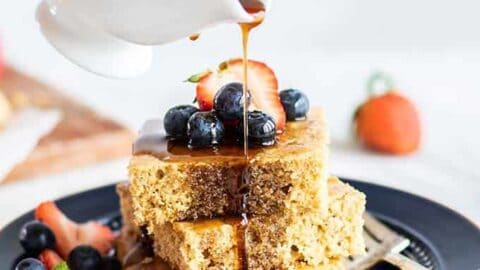 "These Oven Baked Pancakes are a great weekend family breakfast! Forget serving 1 person at a time — with this sheet pan pancake recipe, everyone can enjoy hot pancakes at the same time. These gluten free pancakes are made with whole grain oat flour."