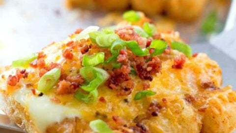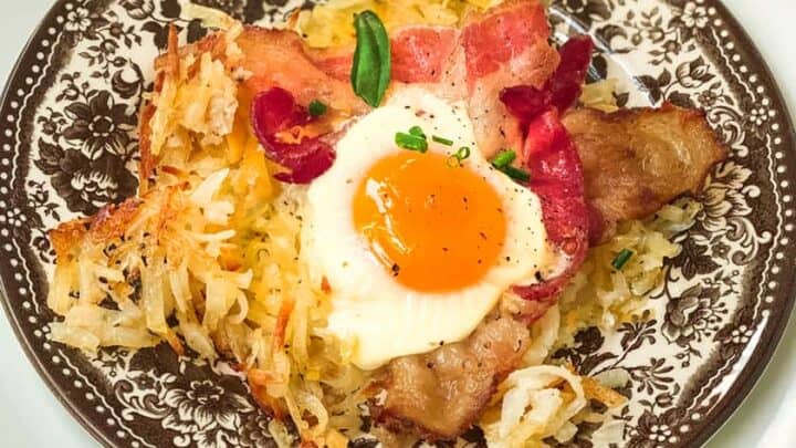 “No need to dirty up another pan! You’ll have a FULL BREAKFAST with eggs, bacon and cheesy crisp hash browns on ONE SINGLE PAN!”
