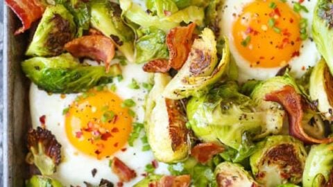 A complete breakfast with eggs, crisp bacon and roasted brussels sprouts! Quick/easy with one pan to clean!”