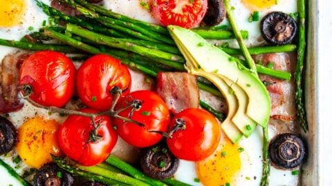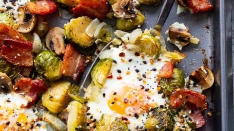 "This paleo sheet pan breakfast hash is perfect for when you want a set it and forget it breakfast! The veggies and bacon roast in the oven and the eggs bake on the sheet pan at the very end. It’s low carb and keto friendly, Whole30 compliant, super easy and full of flavor!"