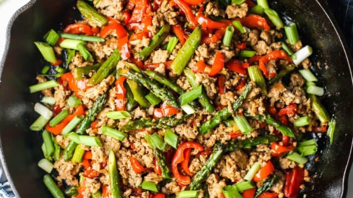 "A quick and delicious one-pan stir-fry recipe made with ground turkey, earthy green asparagus, and sweet bell pepper in a flavourful soy sauce-based sauce." Serve over rice.