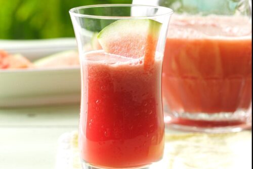 "My family gulps this frosty cooler because we love, love, love watermelon. The strawberries give it an extra pop. This is a perfect drink" for summer heat.