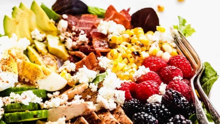 "Summer Cobb Salad is filled with fresh summer fruits and veggies. It’s loaded with grilled chicken, bacon, hard boiled eggs, avocado, goat cheese, berries, cucumber, grilled corn and tossed in a simple balsamic lime vinegar dressing. Every bite is refreshing, bright, and summery!"