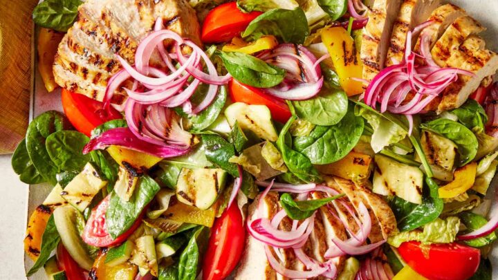 This grilled chicken salad is a delicious healthy summer meal, easy enough for weekdays, or special enough for entertaining. Make the dressing and pickled onions ahead for a quick grill and assemble dinner.