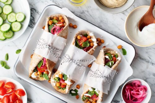 Spiced chicken (or chickpeas!) tucked into flatbread with cucumber, tomato, and a creamy tahini or yogurt sauce-quick to prep and picnic-ready.