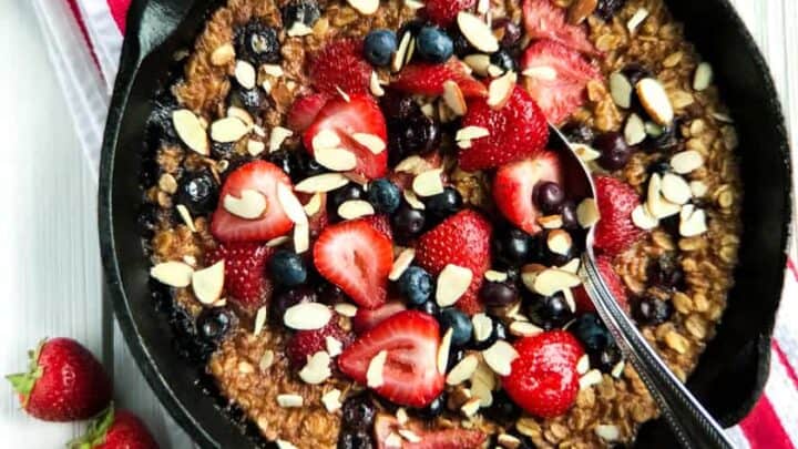 Baked Oatmeal is always a breakfast favorite. When topped with bright red strawberries, they become the ultimate healthy Valentine's Day breakfast!