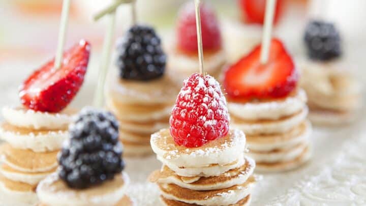 “These pancake mini stacks, garnished with fresh berries and powdered sugar, are ideal for a special breakfast-in-bed or as delightful brunch hors-d’oeuvres.”
