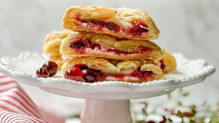 These easy Cranberry Cream Cheese Danishes are twirls of flaky puff pastry braided over layers of sweetened cream cheese and a delicious cranberry filling with hints of cinnamon and citrus.