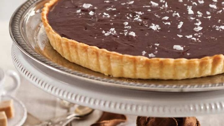 "A flaky crust, rich with butter, rims a layer of espresso-infused caramel and a velvety filling of bittersweet ganache sprinkled with sea salt in this Chocolate-and-Salted-Coffee Caramel Tart."
