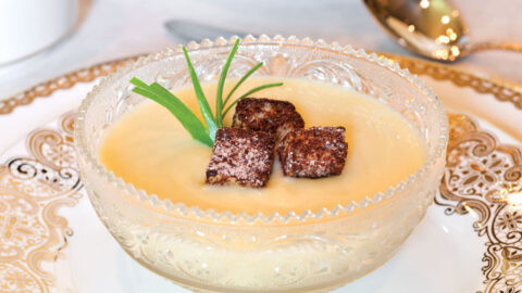 “This sweet-and-savory combines the flavors of parsnip-leek soup with chocolate brioche croutons.”
