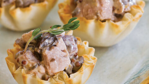 “Delicate and decadent tea savories are made simple with these Roast Pork Salad Mini Phyllo Cups.”