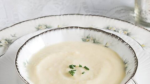 "Flavored with chives, russet potatoes, leeks, and cauliflower florets, this scrumptious Cauliflower-Leek Soup is a light and refreshing savory to serve for afternoon tea."
