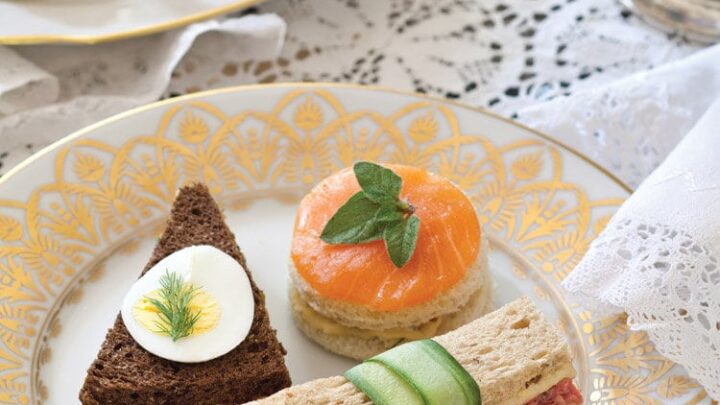 "A plate of distinctively shaped sandwiches creates a hearty mix of options that will satisfy late-afternoon appetites. Clockwise from bottom right: Wrapped in thin strips of English cucumber, rectangular Roast Beef Tea Sandwiches are layered with provolone cheese and Horseradish Cream. Egg-and-Olive Salad mixed with whole-grain mustard is spread between triangles of pumpernickel bread garnished with egg slices and fresh dill. Round Smoked-Salmon Tea Sandwiches topped with fresh oregano feature stacked bread slices slathered with creamy dill spread and pancetta."